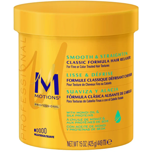 Le défrisant Motion Fin Coloré détend les cheveux fins et colorés tout en respectant leur fibre grâce à une formule nourrissante.